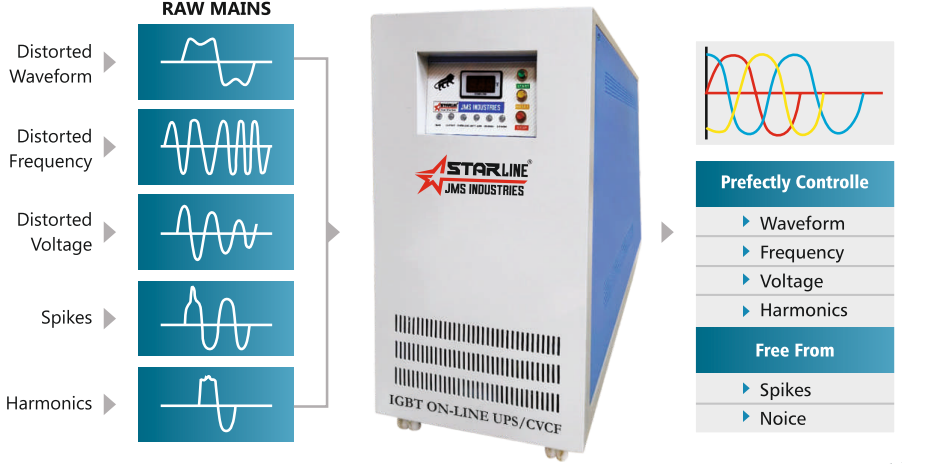 | Indications & Metering | LED PANEL DISPLAYING Input/Output Voltage, Input/ Output Frequency. Battery Voltage, Output Load, Operating Mode(Mains/Battery), Overload/Short Circuit, Battery Low Self Diagnostic Check, Output Status(On/Off), Audio Alarm, Battery Low and Overload | |